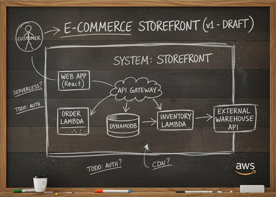 Imagine we are documenting a small, serverless e-commerce application running on AWS. The system needs to: